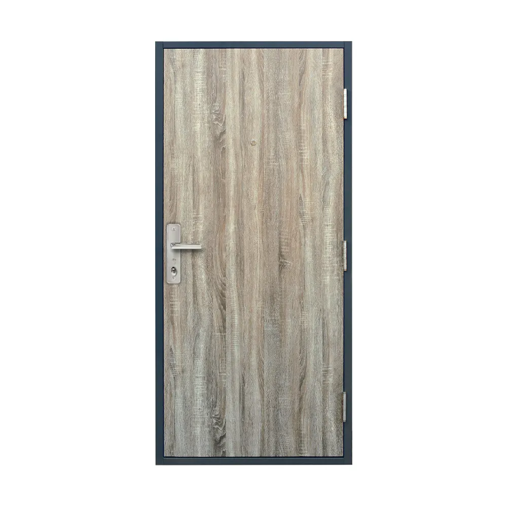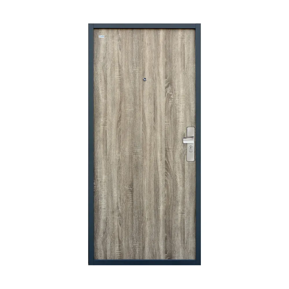 Bezpečnostné dvere z kolekcie SOFIA PLUS so špeciálnou dverovou fóliou s ochrannou laminovanou vrstvou. Zárubňa v odtieni „Šedá – RAL 7031“.