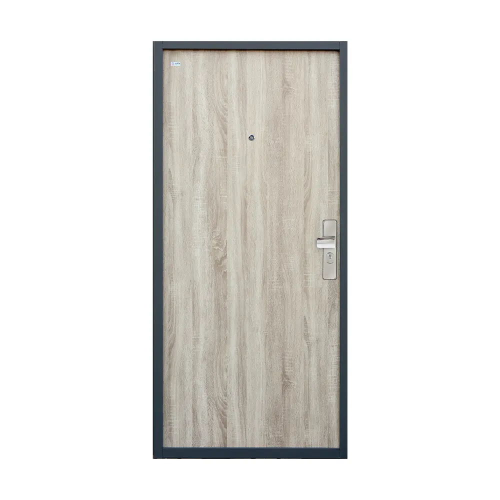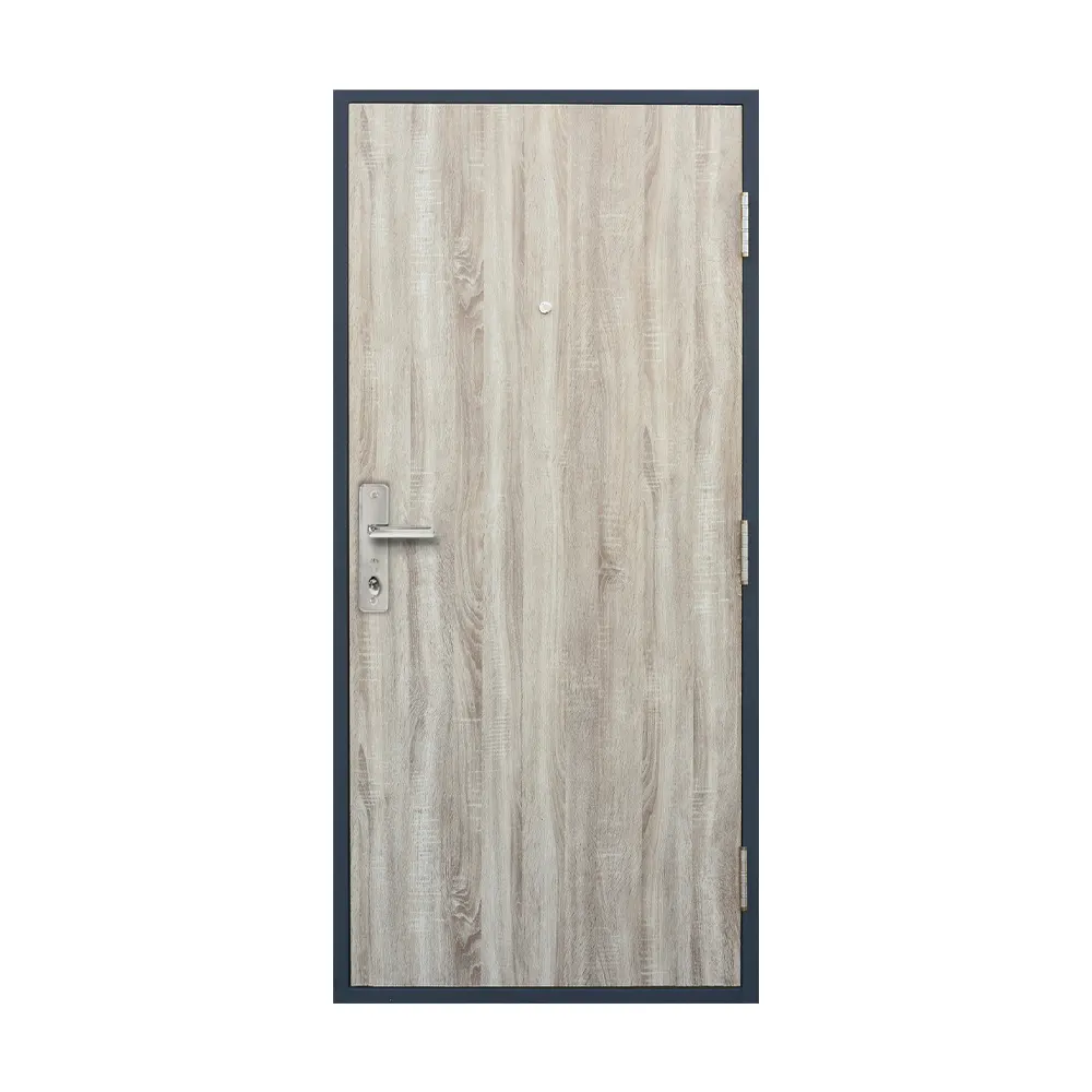 Bezpečnostné dvere z kolekcie SOFIA PLUS so špeciálnou dverovou fóliou s ochrannou laminovanou vrstvou. Zárubňa v odtieni „Šedá – RAL 7031“.